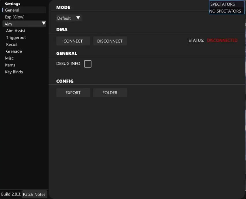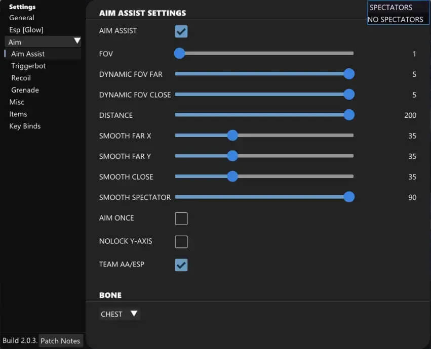 Aimbot ( On / Off ) Aimbot Distance Aimbot Y ( On / Off ) FOV ( Before Lock Target ) FOV Dynamic Far FOV Dynamic Close Smooth Far X Smooth Far Y -> LIVE view Smooth Close Smooth Spectator Auto Bone switcher Aim Once ( On / Off ) Aim Once Duration Bone ( Head / Neck / Chest ) Auto Bone Teammate Aimbot ( On / Off )