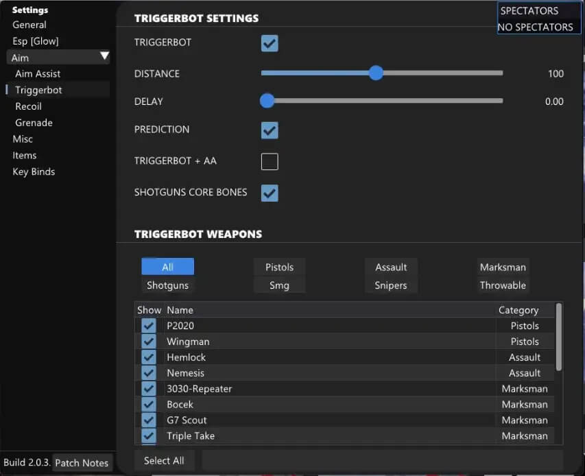 Triggerbot ( On / Off ) Distance Prediction ( On / Off ) Trigger Key Trigger Delay Trigger with Aimbot Always Active ( On / Off ) Trigger Weapon Customization