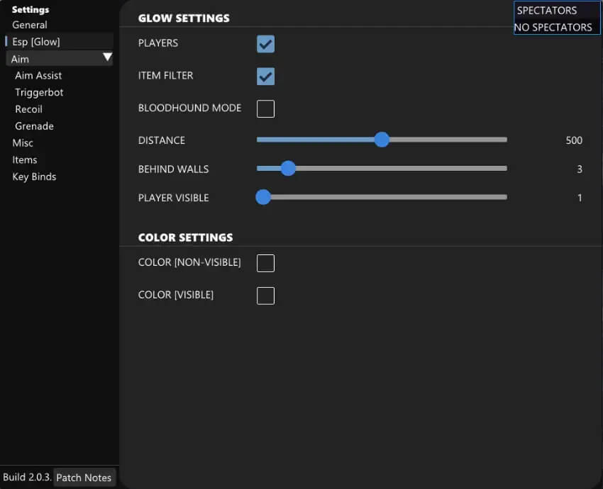 Player Glow ( On / Off ) Teammate Glow ( On / Off ) Visibility Check Visible Glow Color Visible Glow Brightness Non-Visible Glow Color Non-Visible Glow Brightness Glow Distance Visible Check Bloodhound Mode Digital Mode