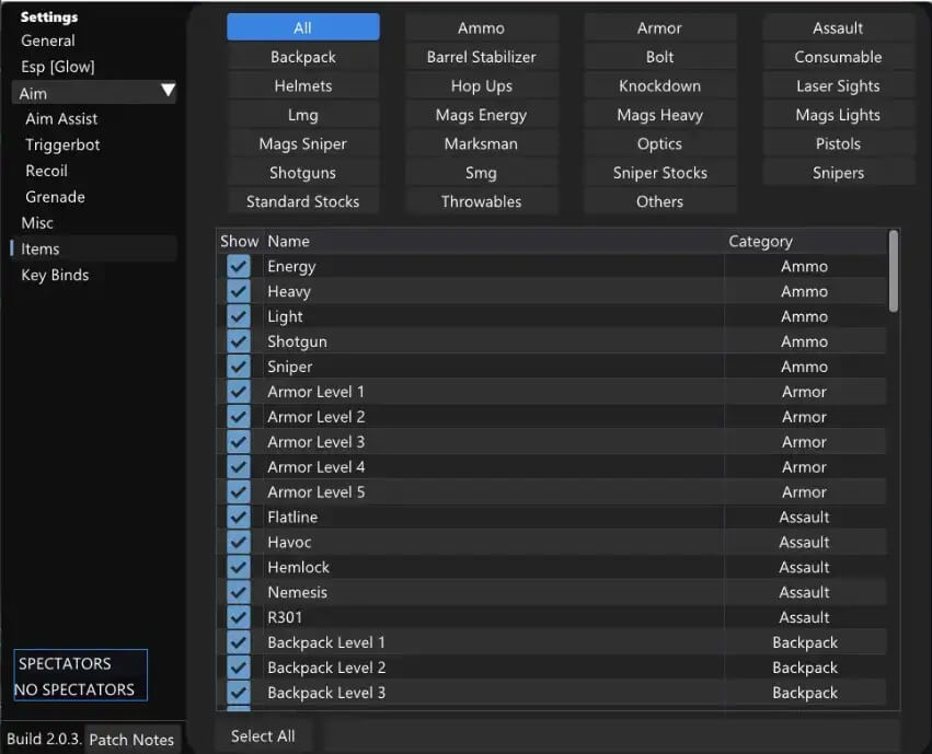 Item Glow Color Based On Health / Armor -> LIVE view Item Filter Caustic Traps Glow Distance Deathboxes Glow Caustic Traps Glow Octane jumpad Glow Loba Ultimate Glow Wattson Fence Glow Wattson Ultimate Glow Rampart Walls Glow Rampart Ultimate Glow Bridge Keycard Glow