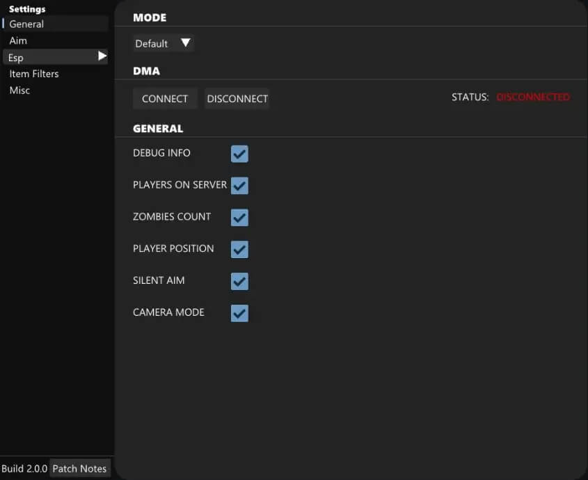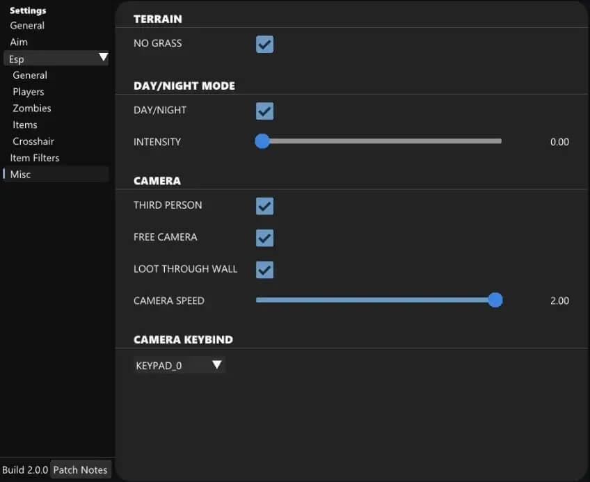 Zombie ESP ( On / Off ) Zombie Distance Zombie Name Zombie Symbol Zombie Render Distance ( 10M - 1000M ) Zombie Color Item Visuals