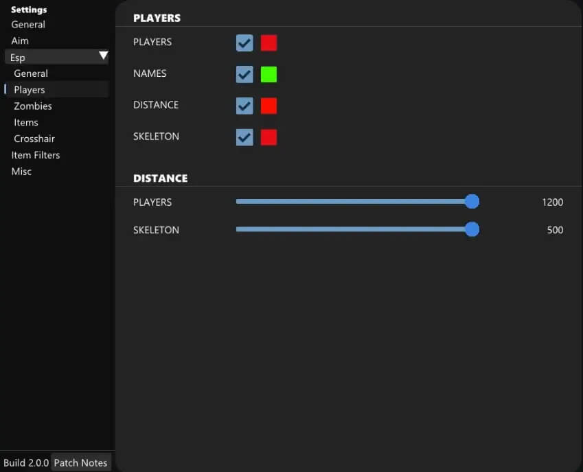 Player ESP ( On / Off ) Player Box Player Name Player Distance Player Skeleton Player Render Distance ( 10M - 1000M ) Player Render Bone Distance ( 10M - 500M ) Player Name Color Player Skeleton Color Ai Visuals