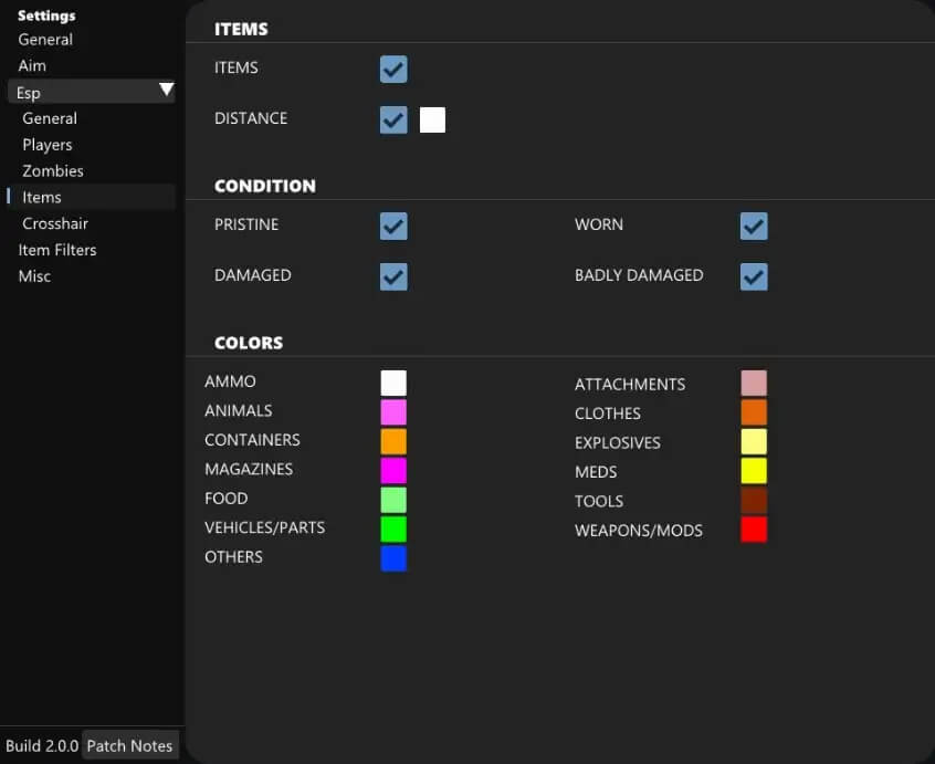 Item ESP ( On / Off ) Item Distance Item Symbol Item filter / Included Modded Servers Item Render Distance ( 10M - 500M ) Pristine Color Worn Color Damaged Color Badly Damaged Color Ruined Color Misc Visuals