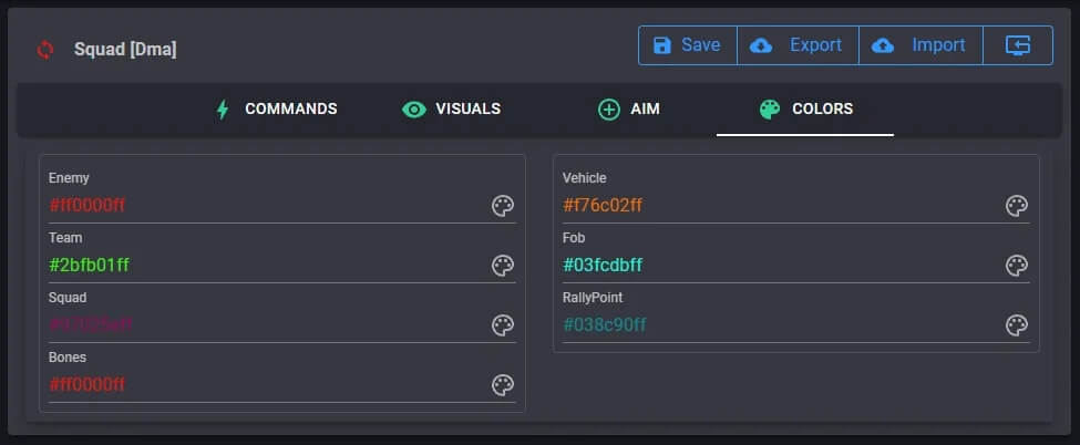 Дистанция отображения игроков Дистанция отображения костей игроков Дистанция отображения транспорта Дистанция отображения точек сбора Дистанция отображения FOB Настройки цвета