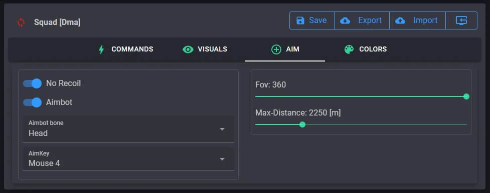 Аимбот (Вкл / Выкл) Клавиша прицеливания Кость прицеливания (Голова / Грудь / Живот) Угол обзора (FOV) Максимальная дистанция Контроль отдачи Без отдачи (Вкл / Выкл) Отображение игроков