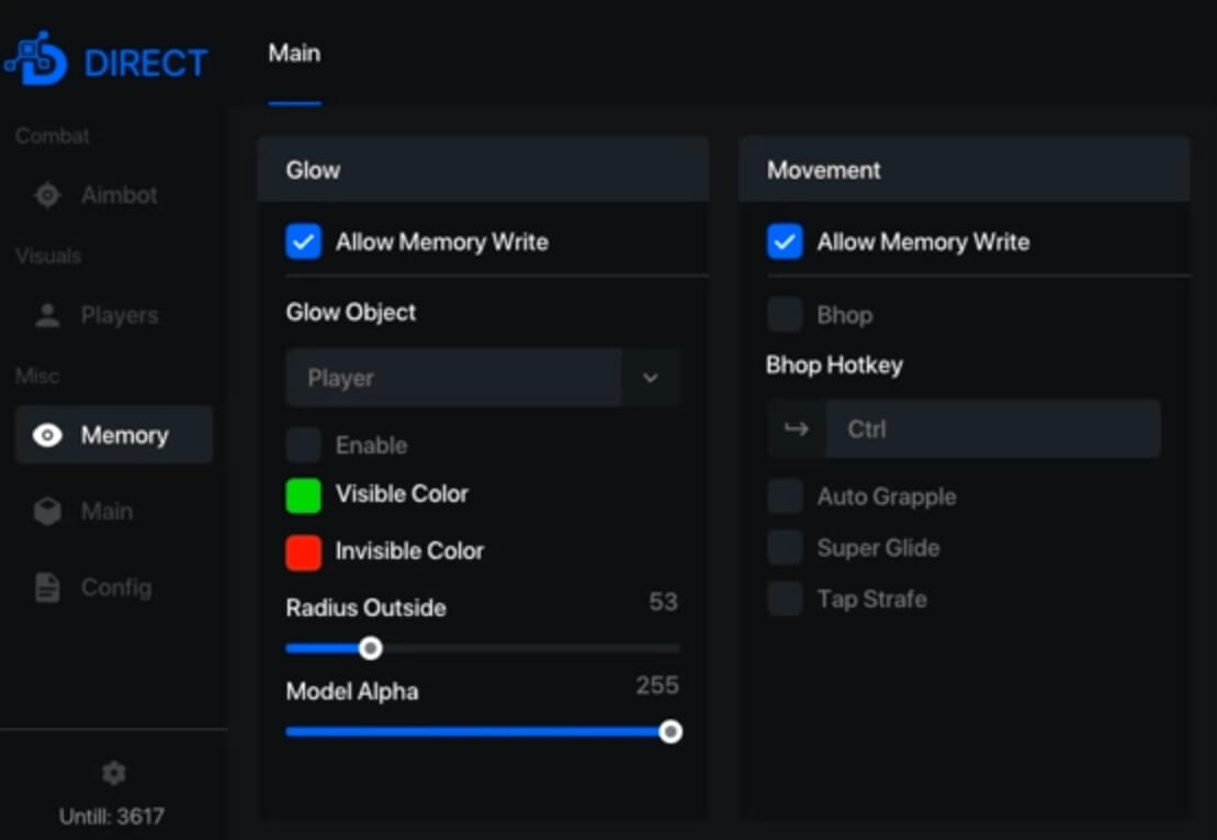 Bunny Hop Автоматический краплинг (Auto Grapple) Авто-планирование (Auto Glide) Авто-прыжок от стен (Auto Wall Jump) Tap Strafe Авто-ближний бой (Auto Melee) Свободная камера (Free Cam) ДРУГОЕ