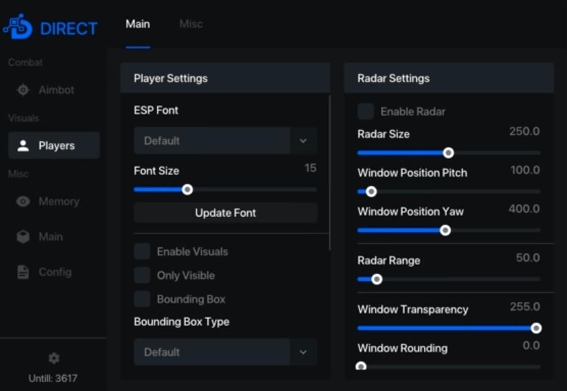 Боксы (Видимые, Невидимые) Имена (Видимые, Невидимые) Дистанция (Видимая, Невидимая) Snaplines (Видимые, Невидимые) Head Dot (Видимый, Невидимый) Индикатор здоровья + щитов (Видимый, Невидимый) Seer Bar Подсветка игроков (Memory Write) Подсветка объектов (Игроки, Локальное оружие, Лут) ESP лута Подсветка предметов (Multi-Combo) (Белый, Синий, Фиолетовый, Желтый, Красный) MISC (Дополнительные функции – Memory Write)