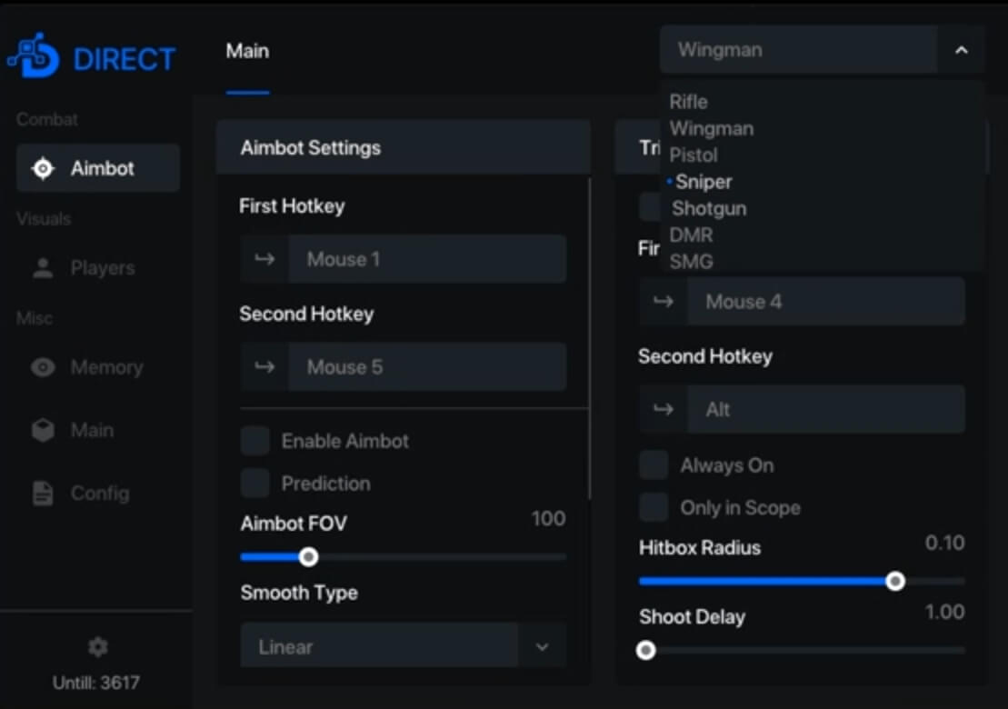 Первая горячая клавиша Вторая горячая клавиша Выбор цели (FOV, FOV + Lock) Aimbot FOV (1 – 20) Сглаживание Aimbot (0.100 – 15.0) Мертвая зона Aimbot Кривая мертвой зоны FOV (15 – 30) Триггербот ВИЗУАЛЫ (ESP & GLOW)