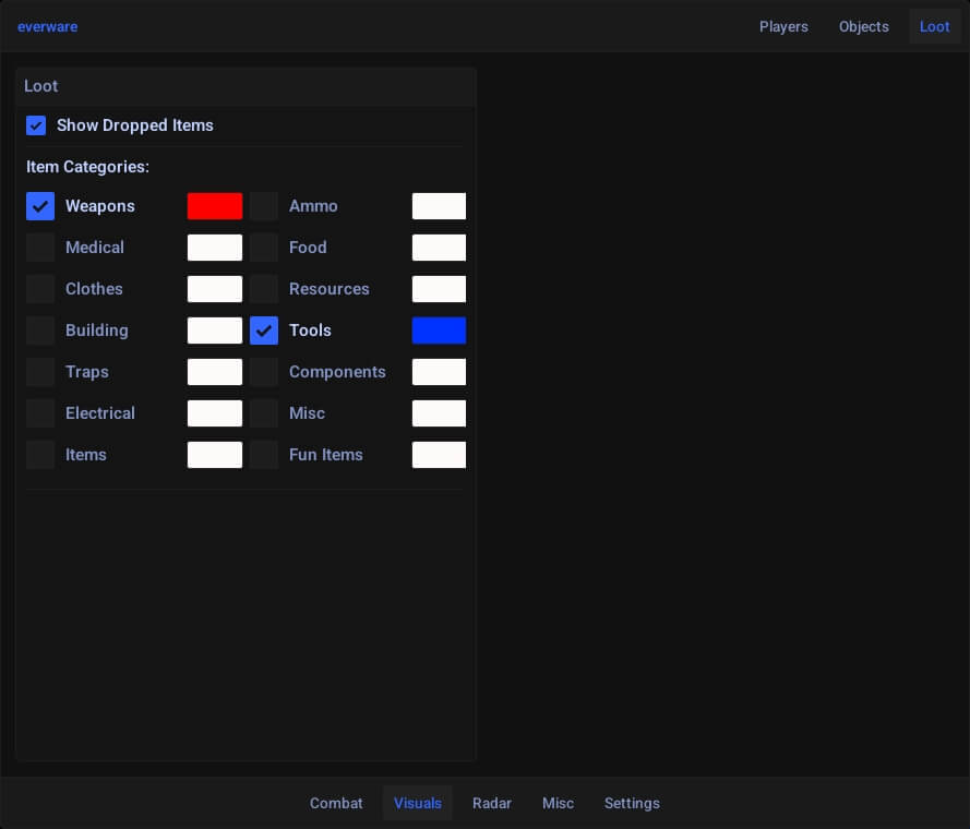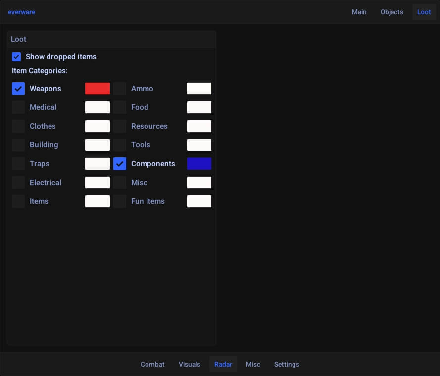 Показ и скрытие каждой категории предметов Индивидуальный цвет для каждой категории Web Radar