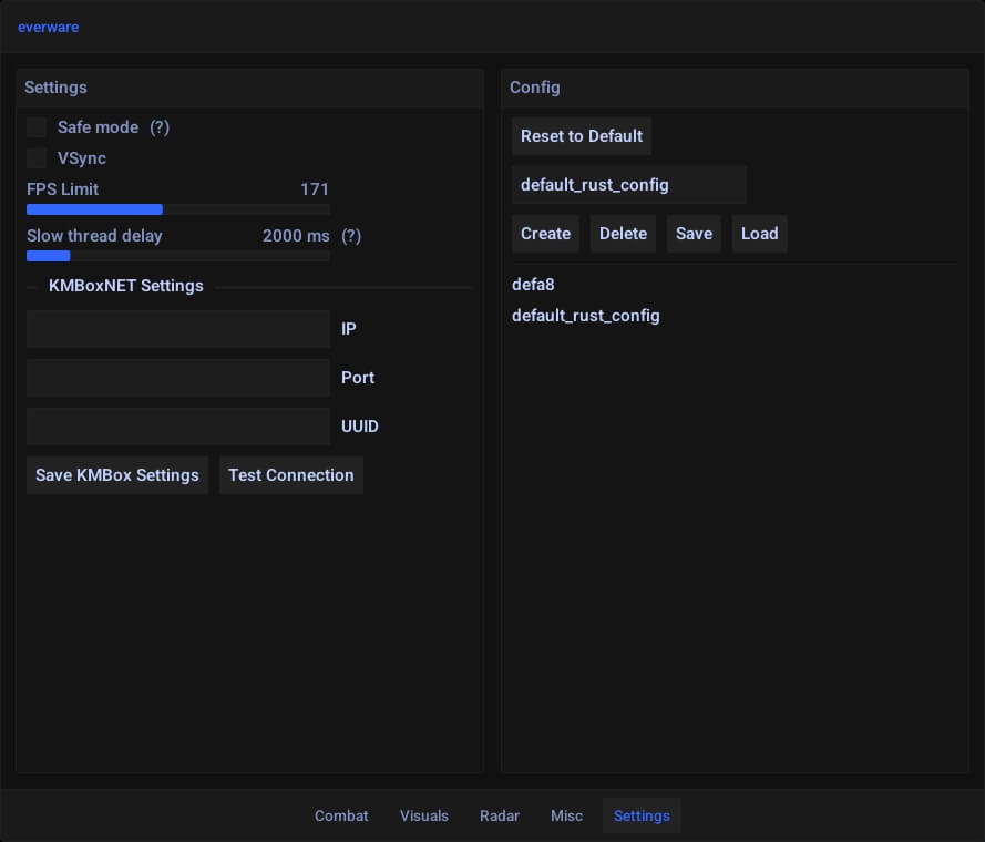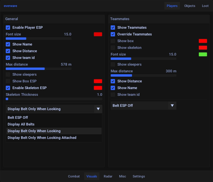 Размер шрифта Цвет текста Отображение имени Отображение дистанции Отображение ID команды Максимальная дистанция Отображение спящих Box ESP Skeleton ESP Цвет скелета Толщина скелета Full Belt ESP Отдельные настройки для тиммейтов Objects ESP