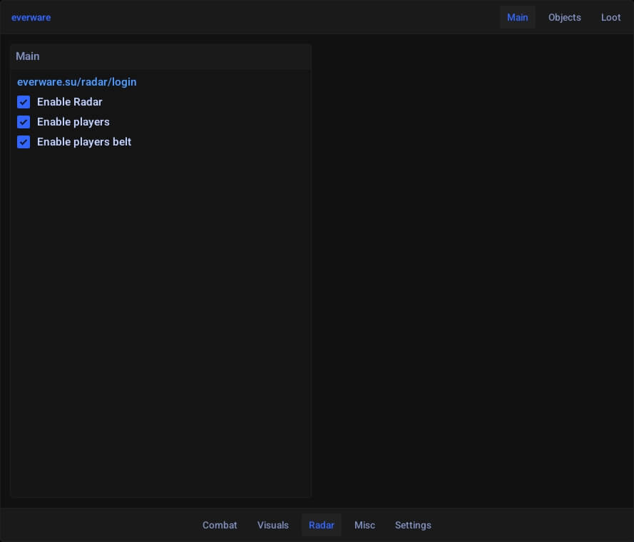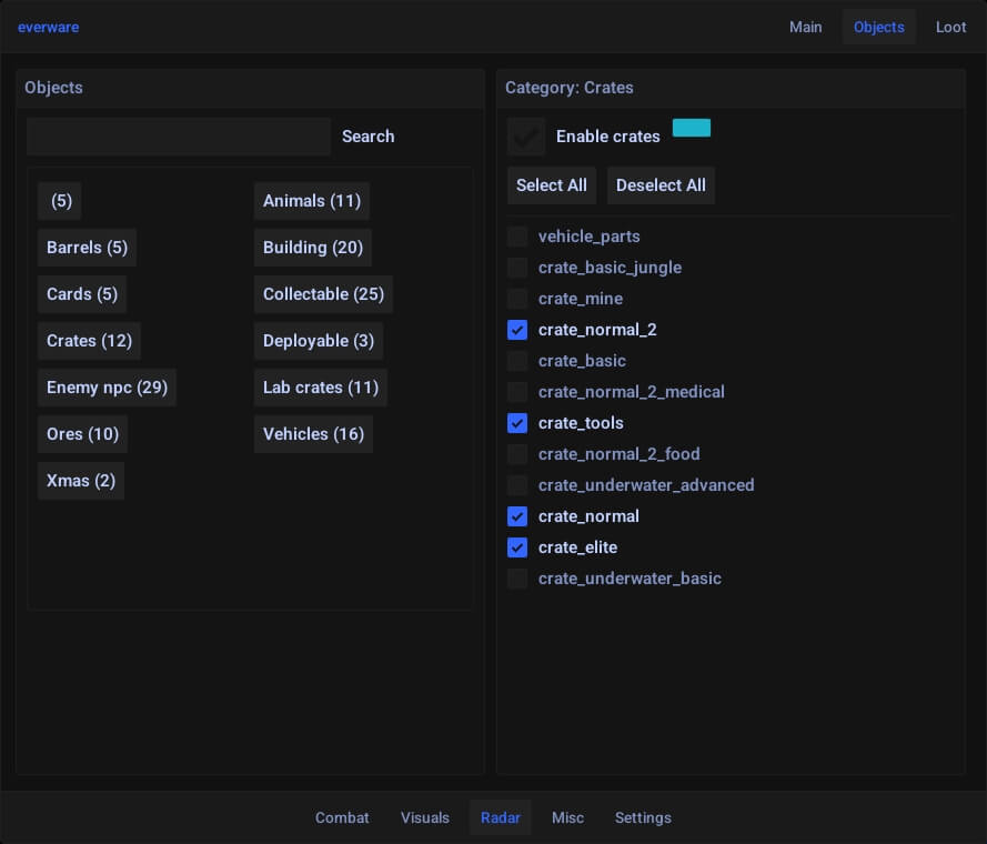 Отображение всех объектов Отображение имени Отображение дистанции Максимальная дистанция Размер шрифта Кастомный выбор отображаемых объектов Loot ESP