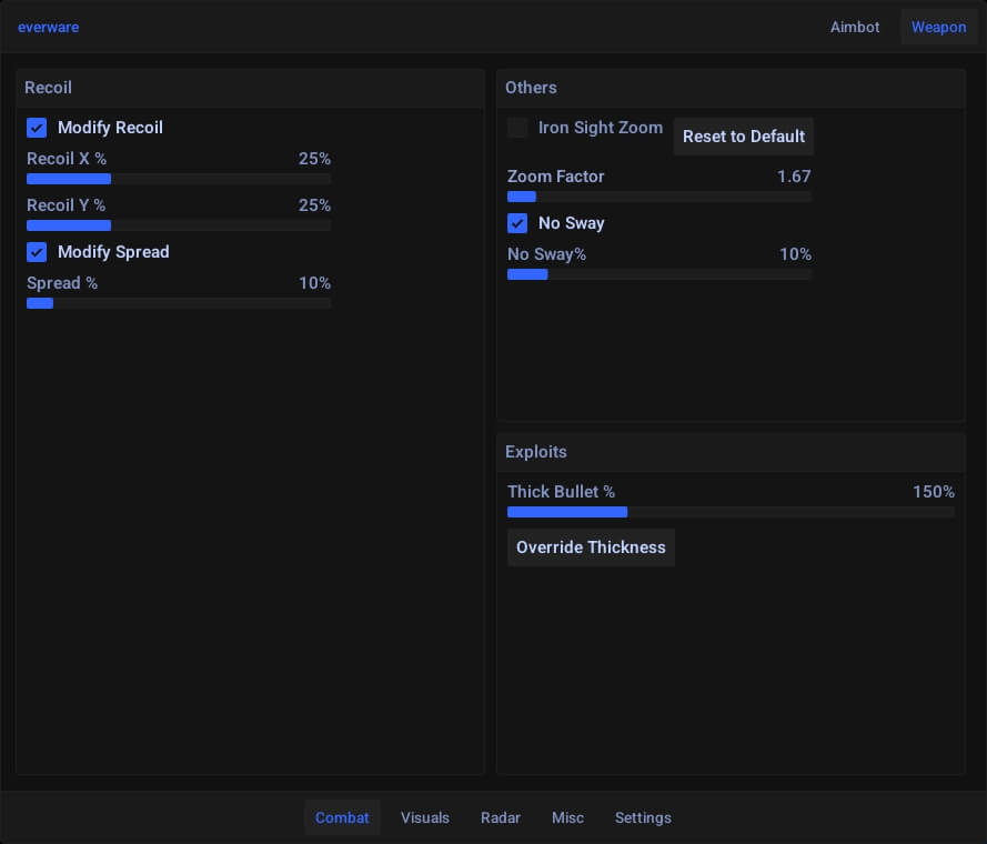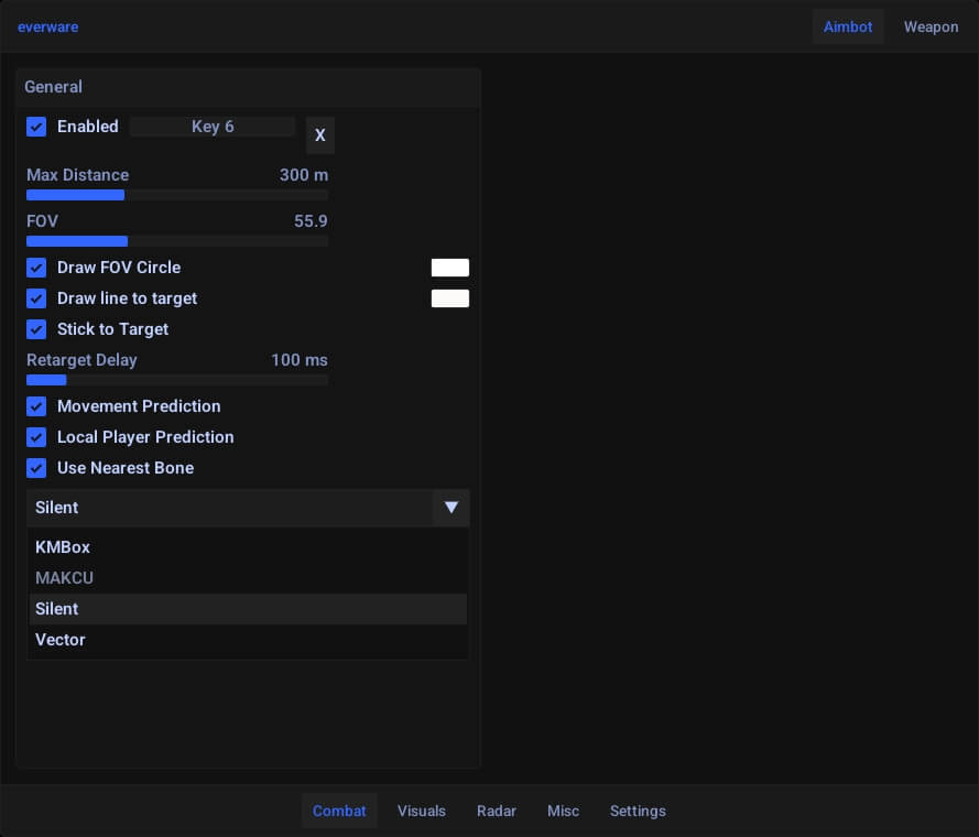 KMbox Makcu Silent Aim Vector Aim Максимальная дистанция FOV Отображение FOV Отображение линии к цели Фиксация на цели Задержка смены цели Предсказание движения цели Предсказание движения локального игрока Выбор костей Настройки оружия Контроль отдачи по X (%) Контроль отдачи по Y (%) Контроль разброса (%) Зум при прицеливании Устранение покачивания (%) Утолщённые пули (%) Players ESP