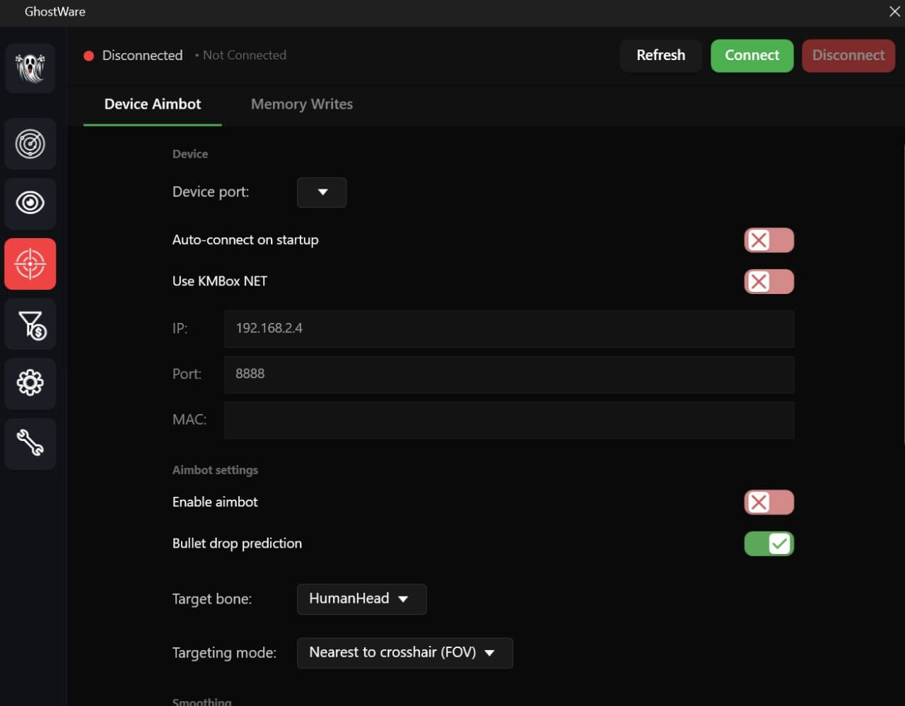 DEVICE AIMBOT (KMBox, Arduino) Поддержка устройств (KMBox, Arduino) Подключение через COM порт Выбор устройства Настраиваемый FOV Максимальная дистанция Режим наведения (Ближайший, Голова, Шея, Грудь, Таз) Предсказание баллистики Фильтры целей (PMC, Scav, Raider, Boss, Guard, PScav) Виджет FOV и линии к цели Цвета виджета (активен, неактивен) Статус подключения устройства Версия устройства MEMORY AIM (SILENT AIM)