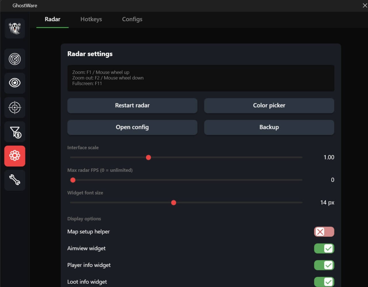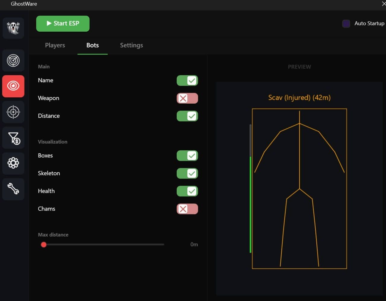 Отображение игроков Отображение ботов Отображение лута Отображение окружения Выходы (информация о доступности) Растяжки Гранаты (траектория и радиус взрыва) Прицел Мини-радар НАСТРОЙКИ ESP