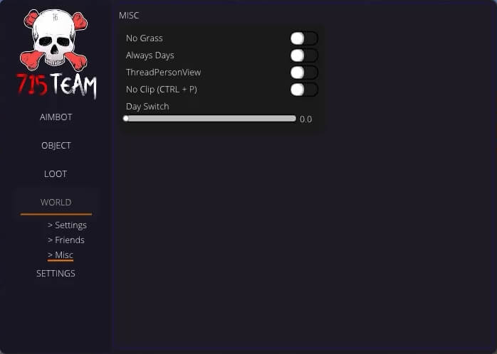 No Grass — remove grass to improve FPS Always Days — force daytime in game ThreadPersonView — enable third-person view on servers where it’s restricted No Clip (CTRL + P) — enable flight mode with loot, interaction and kill ability from any distance Day Switch — configure specific time of day for Always Days Settings