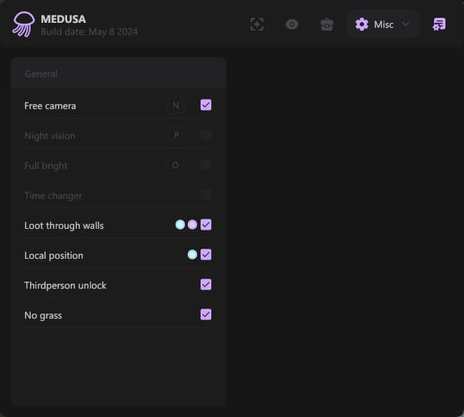 MEDUSA for DayZ is one of the most stable and functional cheats for hardcore survival. The program includes ESP for players and loot, transport, hiding places, animals and airdrops, as well as a convenient radar for monitoring the entire map. The built-in aim assist simplifies firefights, while anti-recoil and improved weapon control enhance accuracy. The cheat is regularly updated for new versions of the game and provides reliable protection against anti-cheat. The interface is easily customizable for any style of play. Using MEDUSA, you gain maximum advantage and confidence in every raid and PvP battle in DayZ.