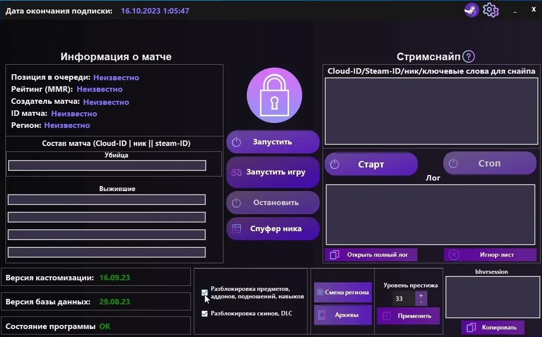 Unlock all the characters from the DLC, including exclusive skins and amulets. Unlock all items, addons, and offerings for each character. Get all the perks and skills, as well as access to additional slots for them. Customize prestige from 0 to 100, creating your own unique style of play. Unlocker is ideal for those who want to unlock the full potential of the game and enjoy all its features without restrictions. Make Dead by Daylight even more exciting and exciting with our cheat!