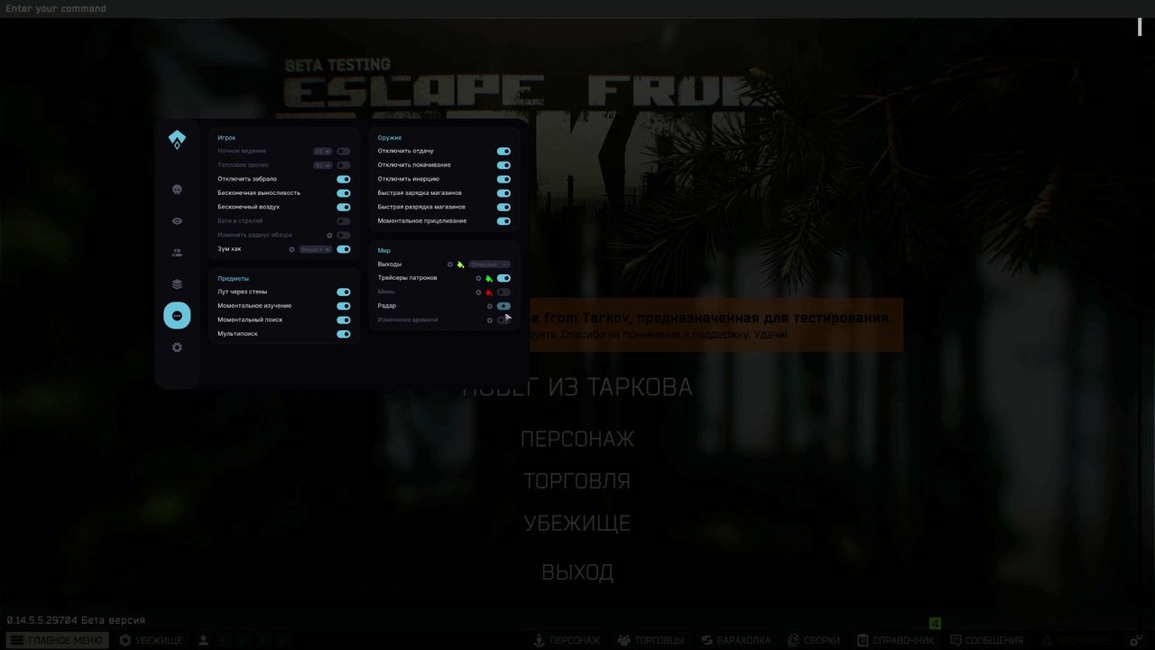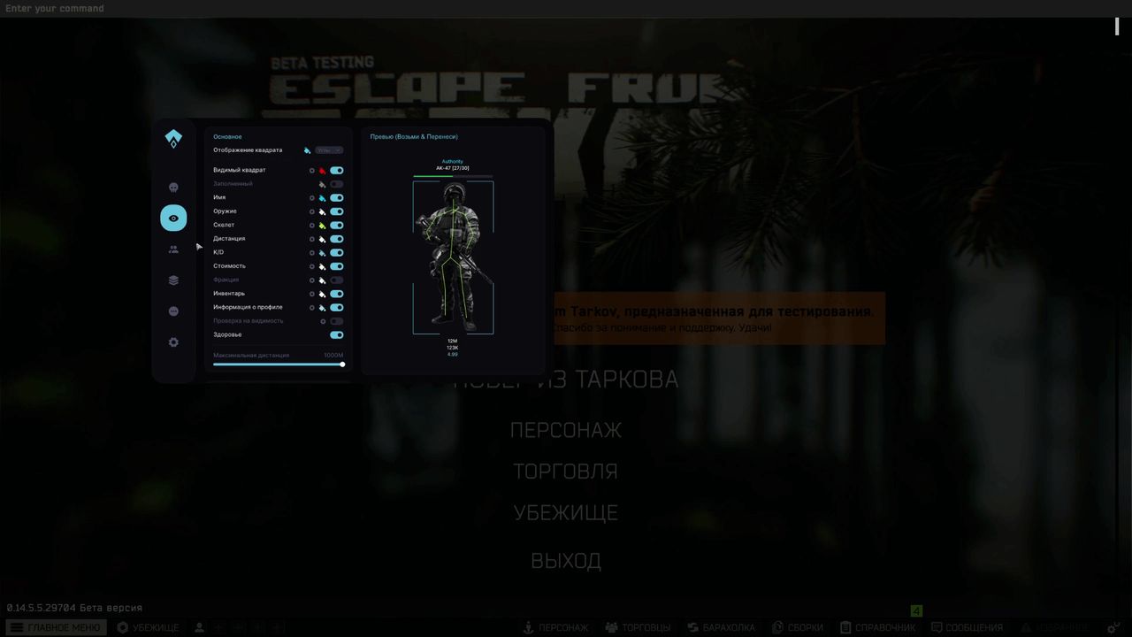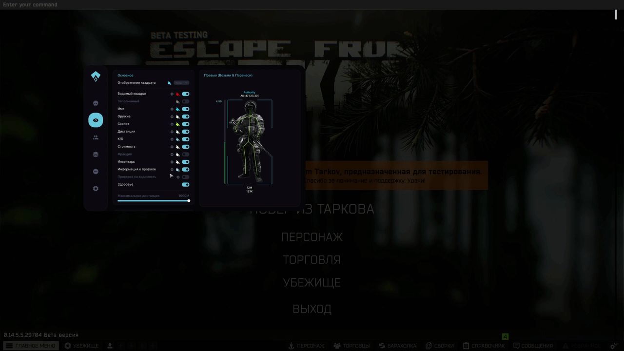 It is compatible with the latest EFT patches and works without lags. It has a convenient menu and fine-tuning of all functions for yourself.