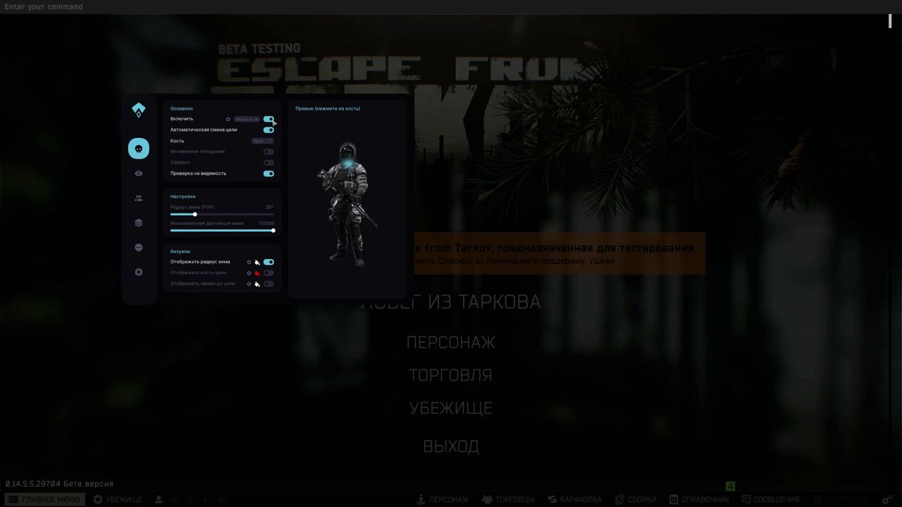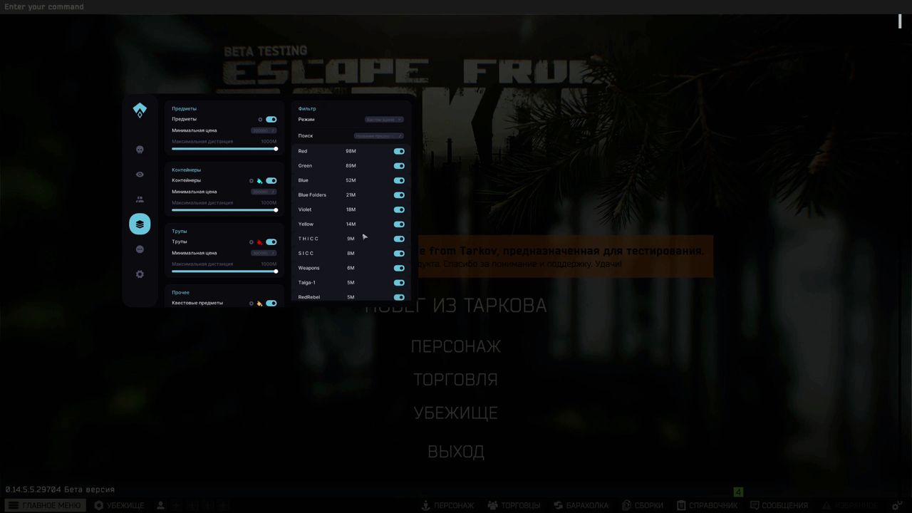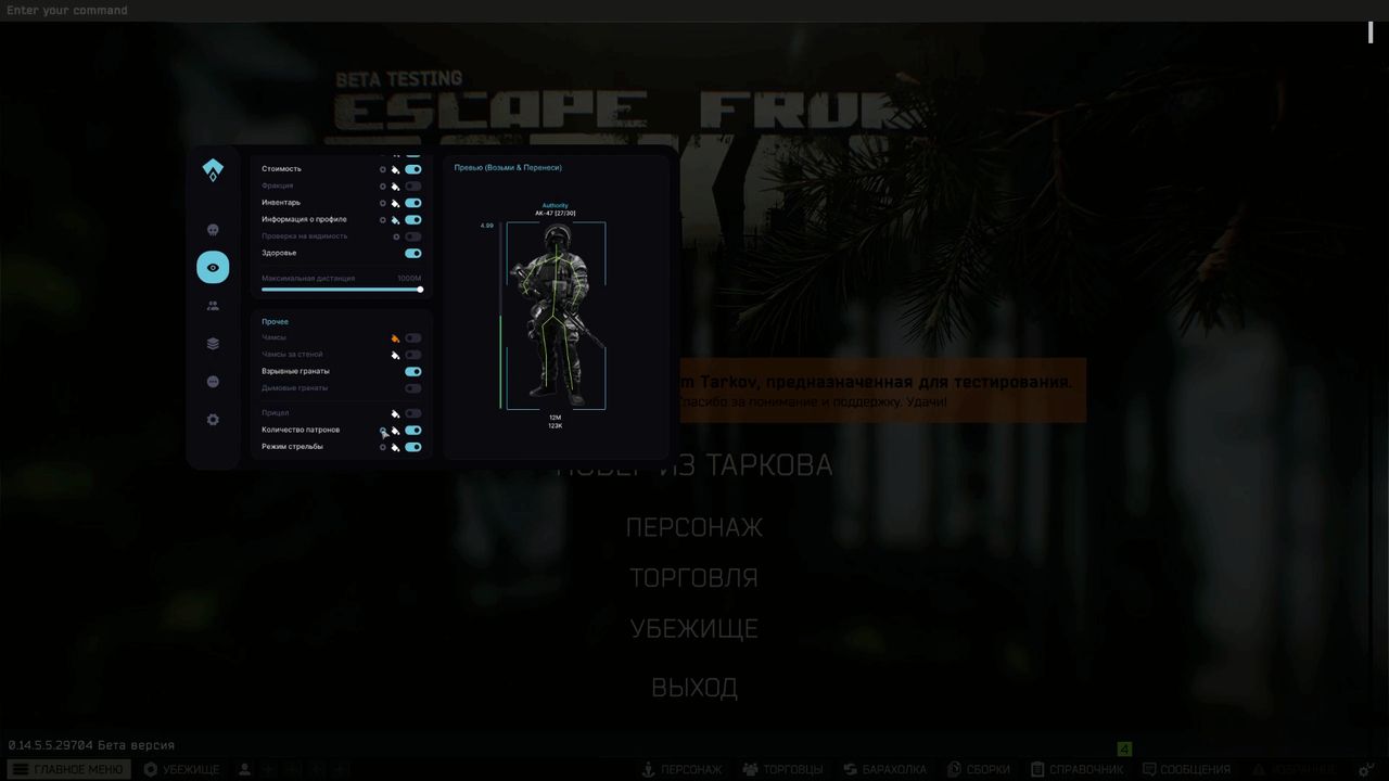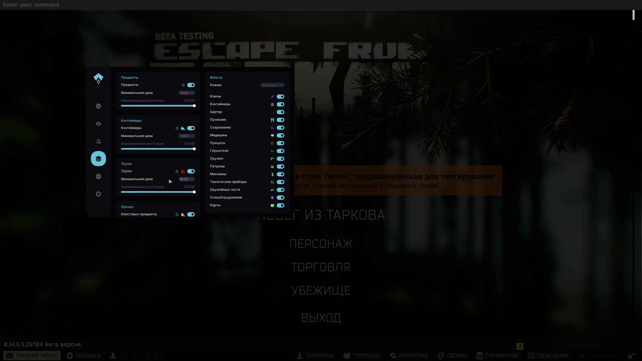 It is compatible with the latest EFT patches and works without lags. It has a convenient menu and fine-tuning of all functions for yourself.
