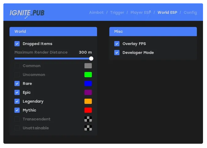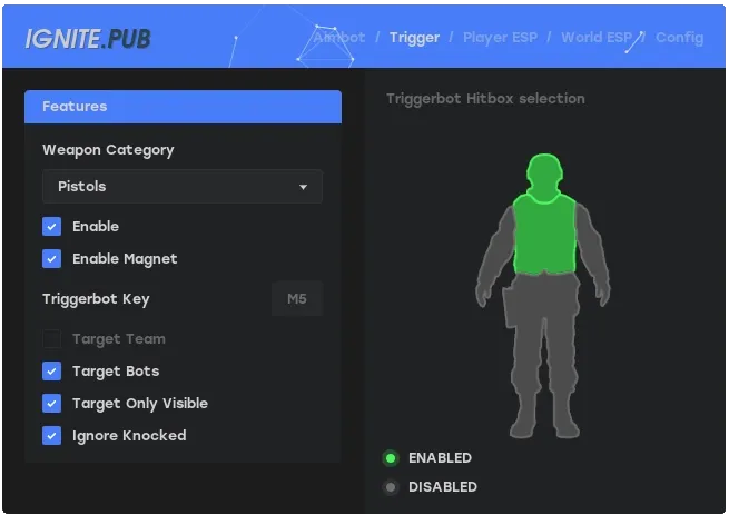 Aimbot — automatic aiming for maximum accuracy of shots. FOV (Field of View) — adjusts the viewing angle to control the situation around you. Triggerbot — instant shooting when aiming at a target. Config — full personalization of functions for an individual game style. Illumination of players and NPCs — easy detection of opponents and allies. Highlighting objects — quickly finding useful loot on the map. Using the Ignite cheat allows you to get the most out of the gameplay, increasing efficiency and simplifying game tasks. Regardless of your experience level, this tool will help you dominate any battle.
