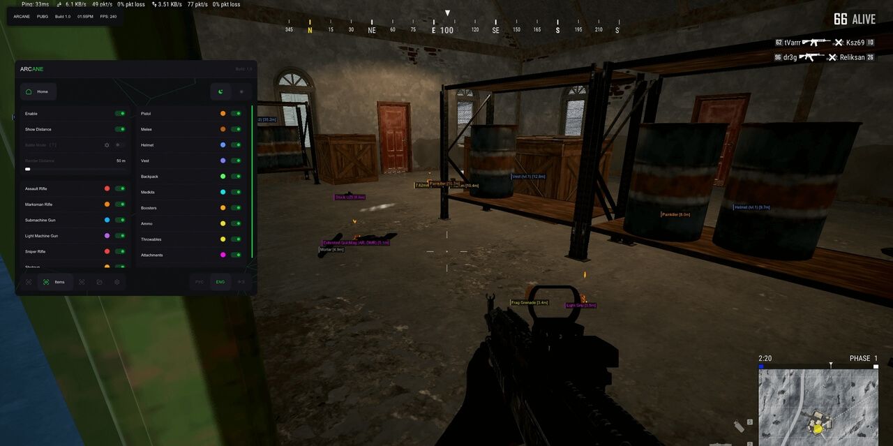 Cheat description Arcane is a private cheat for PUBG offering a full ESP system: player boxes, health bars, nicknames, weapons, loot, vehicles, and crates. Includes visibility checks, off-screen indicators, crosshair, and full config management. Ideal for those seeking a tactical advantage with stable and customizable visuals.