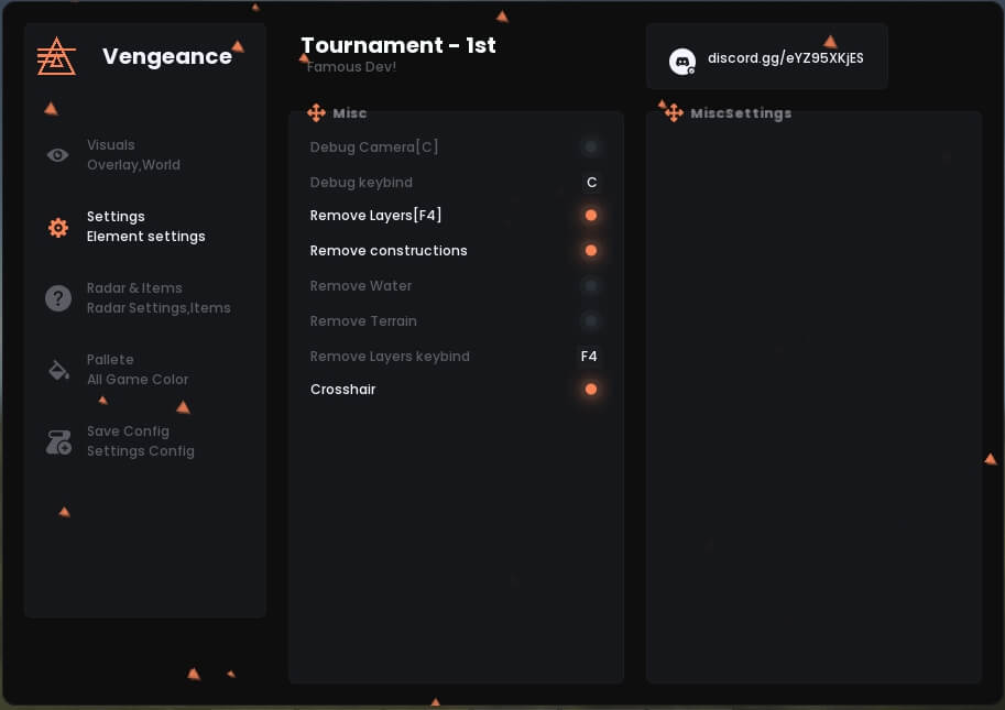 Debug Camera (Safe on FacePunch) — Free view camera Remove Layers — Hide specific map layers Remove Constructions — Hide walls, doors (illegitimate) Remove Water — Hide or make water transparent Remove Terrain — Hide grass, stones for visibility Remove Layers Keybind — Hotkey for quick toggle Crosshair — Static crosshair in the center ITEMS