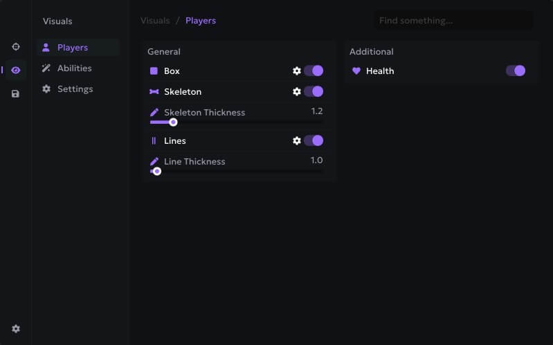 Общее Боксы Скелет Толщина скелета [ползунок] Линии до цели Толщина линии Полоса здоровья Способности