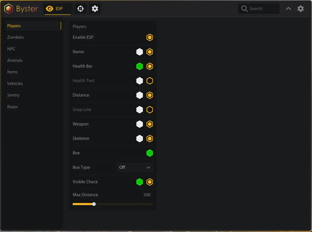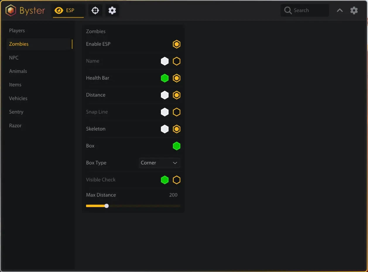 Включить ESP Имя Полоска здоровья Текст здоровья Дистанция Линия Оружие Скелет Бокс (Выкл / Углы / 2D) Проверка видимости Максимальная дистанция ESP — Зомби